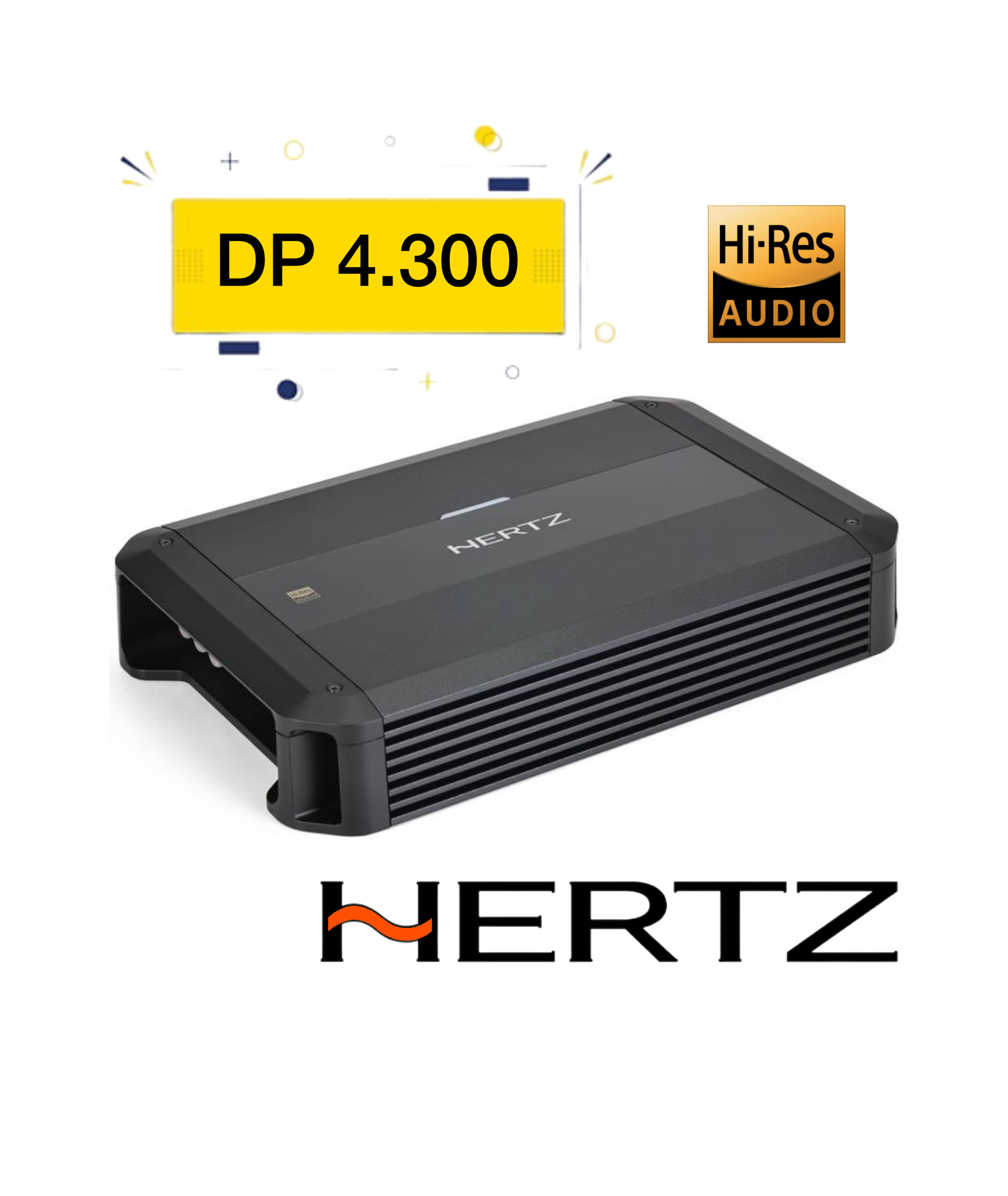 آمپلی فایر هرتز Hertz DP 4.300 از لاین دایچی برند ایتالیایی هرتز که توان 60 وات  RMS  در 4 اهم نشانگر قابلیت درایو کردن کامگوننت و بلندگو ها میباشد این آمپلی فایر با داشتن گواهی  HI-RES  میتوان گفت که میتواند در بالاترین حسالت ممکن از لحاظ کیفیت درایور های شما را درایو کند همچنین با داشتن ورودی SPEAKER INPUT  میتوان مستقیم آن را به پخش کننده های فابریک وصل کرد.