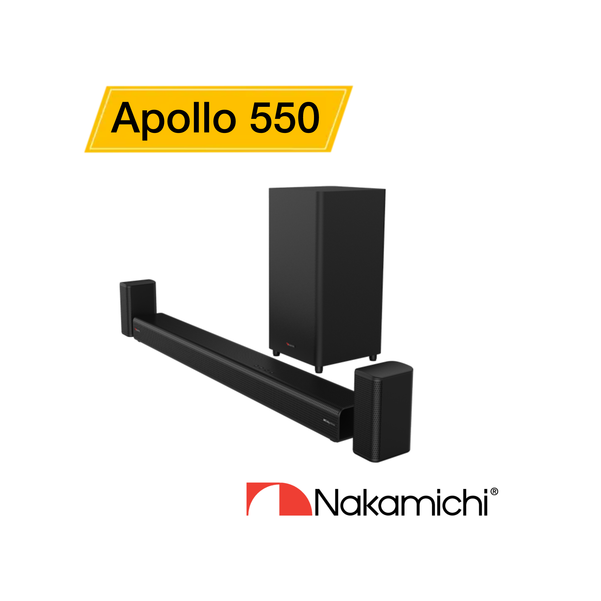 ساندبار Nakamichi Apollo 550 یک سیستم صوتی همهجانبهی خانگی با قابلیت پشتیبانی از فرمت 5.1.2 کانال و فناوری Dolby Atmos است. طراحی شده تا تجربه شنیداری سینمایی را در فضای منزل با حداقل کابلکشی فراهم کند. دارای میانیابی هوشمند، سابووفر بیسیم و اسپیکرهای عقب جهت ایجاد فضای صوتی فراگیر میباشد.